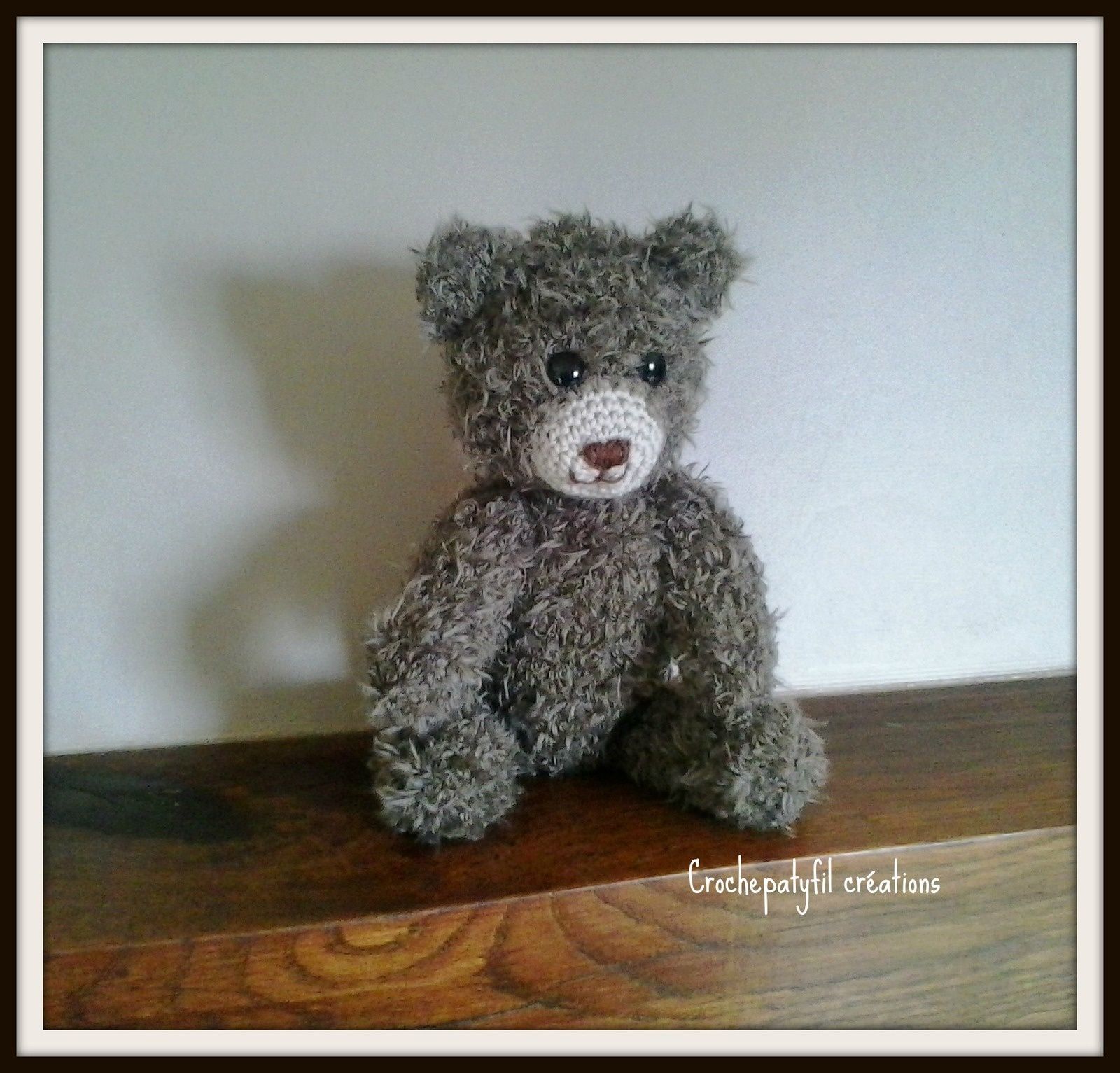 cette semaine Isabelle Kessedjian nous propose de crocheter un doudou monochrome,j'ai opté pour un ours vintage! c'est la 1ere fois que je crochète avec cette laine pelucheuse!(c'est un peu la galère quand on est habituée avec le lisse!) mais bon...j'ai raté les bras que j'ai du refaire 2 fois!(on ne voit pas les points avec cette laine!) puis le corps qui était trop gros, ça fait plusieurs années que je crochète surtout des doudous mais c'est la 1ere fois que fait dans ce genre de peluche,(je ne pense pas en refaire!) enfin encore un défi de fait. Il mesure 18 cm,(petit heureusement ! je l'ai fait avec un reste de laine que j'avais acheté pour la queue de mon écureuil).Je dois dire aussi que le nounours de mon beau fils m'a inspiré,on la mis sous verre car il est un peu grand pour les doudous!)